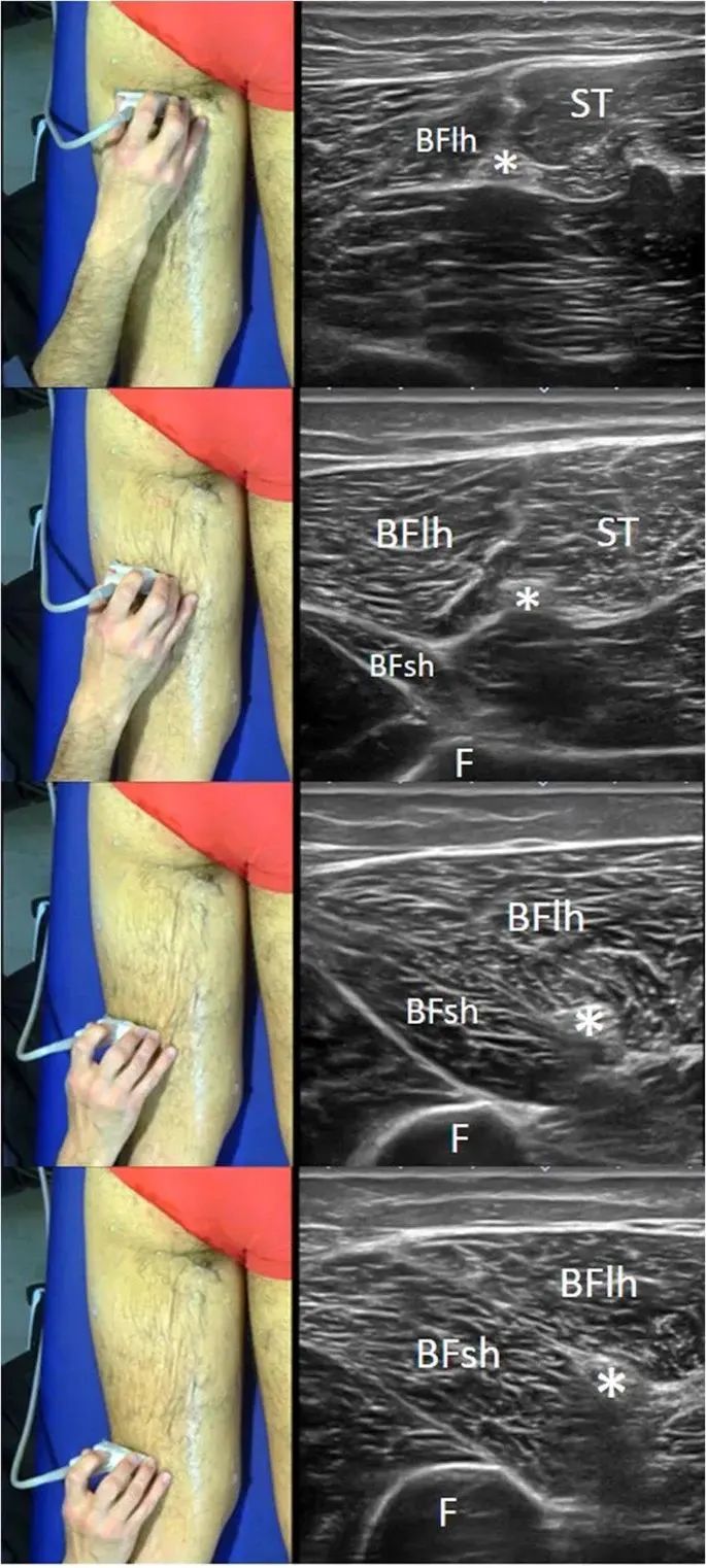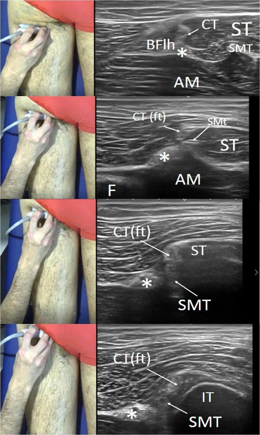 (圖4:短軸超聲掃描顯示腘繩肌近端部分(音叉手柄)的不同視圖。當探頭向近端方向移動時,可以看到總腱和半膜肌腱的部分接近坐骨神經(jīng),直到觀察到高回聲線,并具有與坐骨結(jié)節(jié)一致的后聲影。BFlh股二頭肌長頭、ST半腱肌、AM大收肌、SMT半膜肌腱、CT總腱、*CT (ft)*總腱游離腱部分、( *** ) 坐骨神經(jīng)。圖左側(cè)的照片表示探頭定位。)