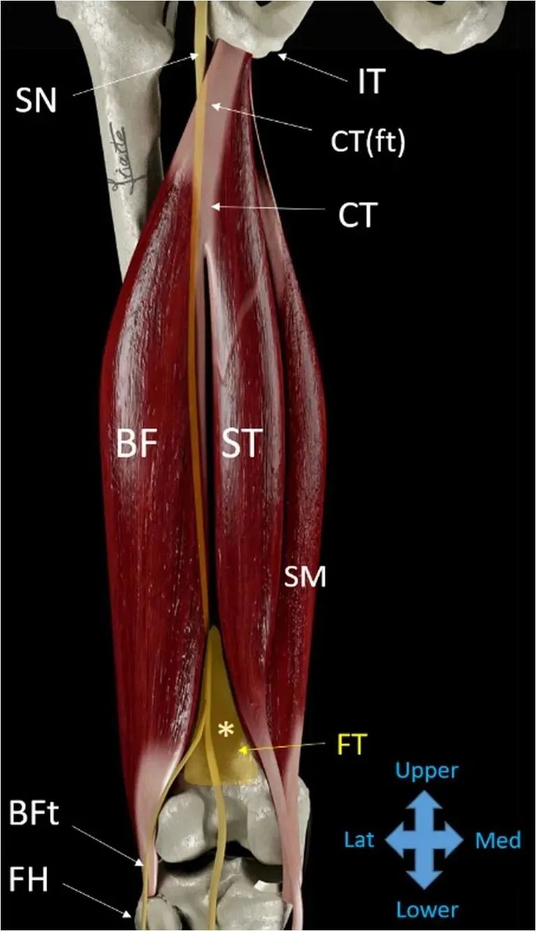 圖1:腘繩肌。BF股二頭肌、ST半腱肌、SM半膜肌、CT總腱、CT(ft)總腱游離肌腱部分。SN坐骨神經(jīng),IT坐骨結(jié)節(jié),F(xiàn)H腓骨頭,F(xiàn)TBF和 ST/SM 肌肉之間的空間脂肪組織,*BF股二頭肌和 ST半腱肌/SM 半膜肌之間的血管和神經(jīng)插入。