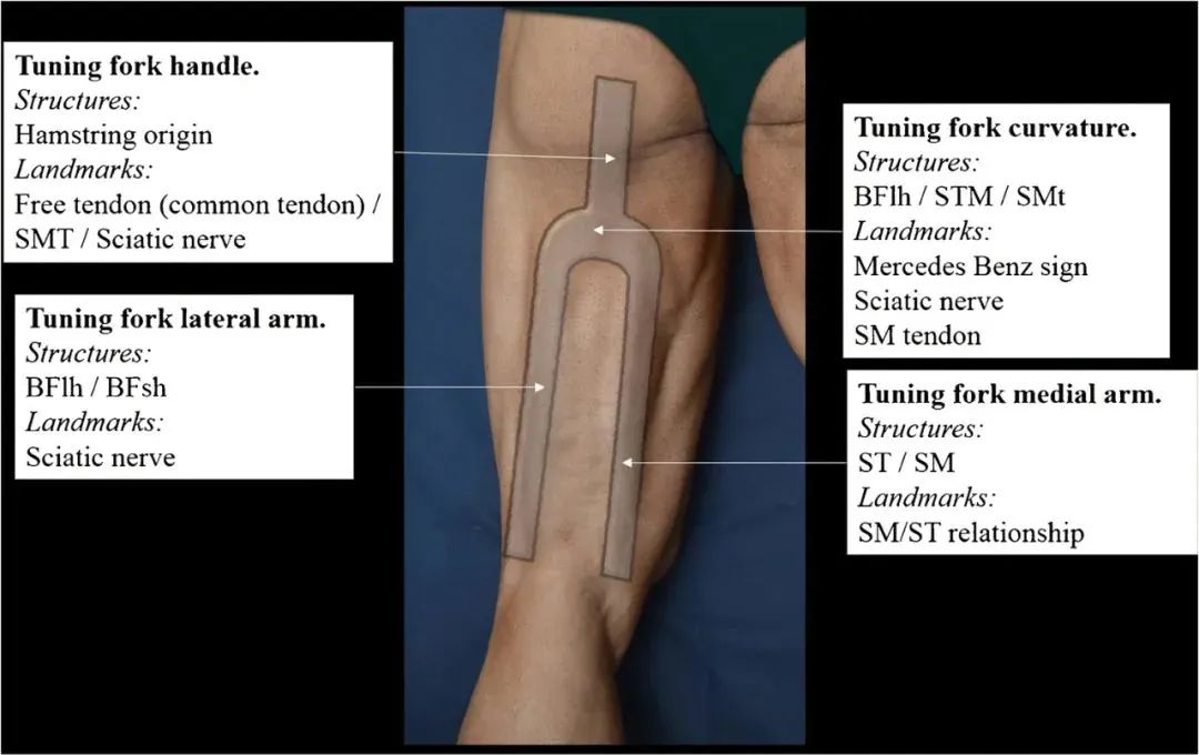 本文為方便交流與學習,把腘繩肌的肌骨超聲比作倒置的音叉,并分為四個部分: