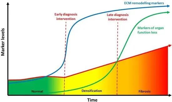細(xì)胞外基質(zhì)重塑的生物標(biāo)志物(藍(lán)線)可以識別在致密化早期階段(左側(cè)虛線)發(fā)生的分子過程,從而在纖維化開始之前(右側(cè)虛線)仍然可逆時提供早期干預(yù)的機(jī)會。ECM:細(xì)胞外基質(zhì)。