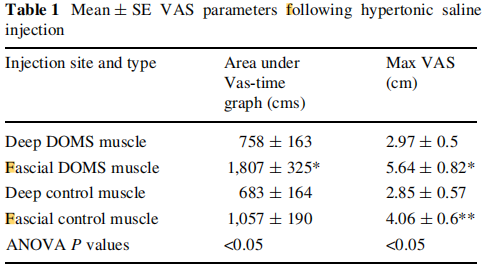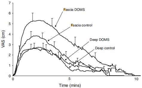 這項(xiàng)研究表明,與離心運(yùn)動(dòng)后的深部肌肉注射相比,直接向筋膜/皮下組織注射高劑量生理鹽水會(huì)增加疼痛。深部肌肉注射后(在最大感受敏感部位)沒有增加疼痛反應(yīng),這意味著組織特異性在與DOMS相關(guān)的疼痛感知中很重要。