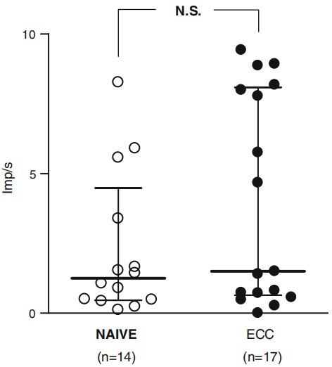 (圖2:對(duì)高滲鈉溶液的反應(yīng)幅度。在高滲鈉溶液期間(30 s)+隨后的60 s內(nèi),通過平均傳入放電率給出的反應(yīng)幅度的中位數(shù)(IQR)。對(duì)照組1.25 imp/s(IQR;0.46–4.48 imp/s)對(duì)比離心組1.50 imp/s(IQ;0.65-8.08 imp/s。無(wú)顯著差異,p=0.32。ECC離心組,NAíVE對(duì)照組,NS不顯著)