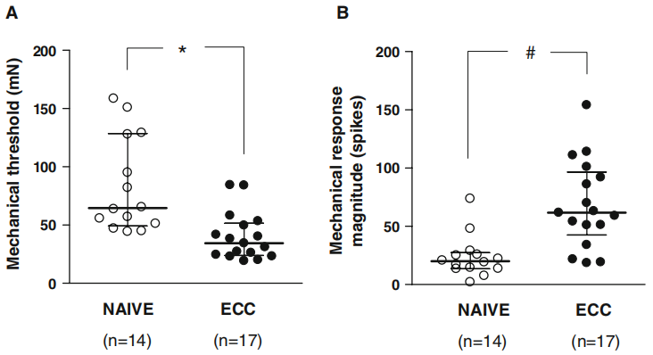 (圖4:對(duì)照(naive)和離心(ECC)組大鼠EDL肌肉對(duì)斜坡機(jī)械刺激的機(jī)械閾值和機(jī)械反應(yīng)的比較。a*:與對(duì)照組相比,離心組的機(jī)械閾值顯著降低。離心率34.4mN(IQR:23.9-51.6mN)與對(duì)照64.6mN(IQR:49.2-128.6mN),P<0.001,非參數(shù)檢驗(yàn)。b#:離心組的機(jī)械反應(yīng)幅度明顯高于對(duì)照組。離心率61.7mN(IQR;42.5-96.5mN)與對(duì)照20.0mN(IQR;13.7-27.4mN),P<0.001,非參數(shù)檢驗(yàn)。)