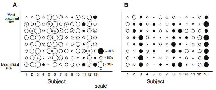 (圖5:第2天的壓痛閾值(PPTs)(第1天的百分比)。a運(yùn)動(dòng)(離心)腿離心運(yùn)動(dòng)后24小時(shí)脛骨前肌最大敏感部位。b控制腿中的PPT??招膱A圈表示PPT減少,實(shí)心圓圈表示PPT增加。圓圈的大小表示PPT百分比變化的大小。PPT縮減幅度最大的點(diǎn);即最敏感的部位(僅顯示在鍛煉過的腿上))