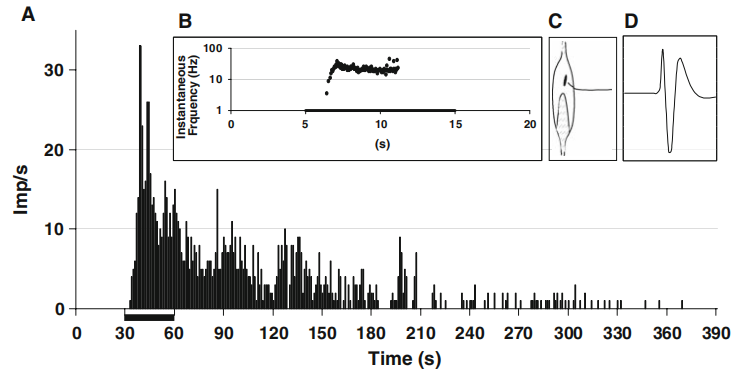 (圖1a:顯示了IV組大鼠離心運(yùn)動(dòng)肌肉制劑對(duì)高滲鈉溶液(734 mM)傳入神經(jīng)的反應(yīng)模式。將高滲鈉溶液灌流到已識(shí)別的感受區(qū)中30s-橫坐標(biāo)粗線條表示;b:該纖維的機(jī)械響應(yīng)用瞬時(shí)頻率圖表示。施加斜坡機(jī)械刺激,在10秒內(nèi)從0線性增加到196 mN(橫坐標(biāo)上的粗條);c:該纖維的感受區(qū)位于該EDL肌肉的前側(cè)。上肌腱朝向近端。著色顯示腱狀區(qū)域;d:記錄受體尖峰形態(tài))