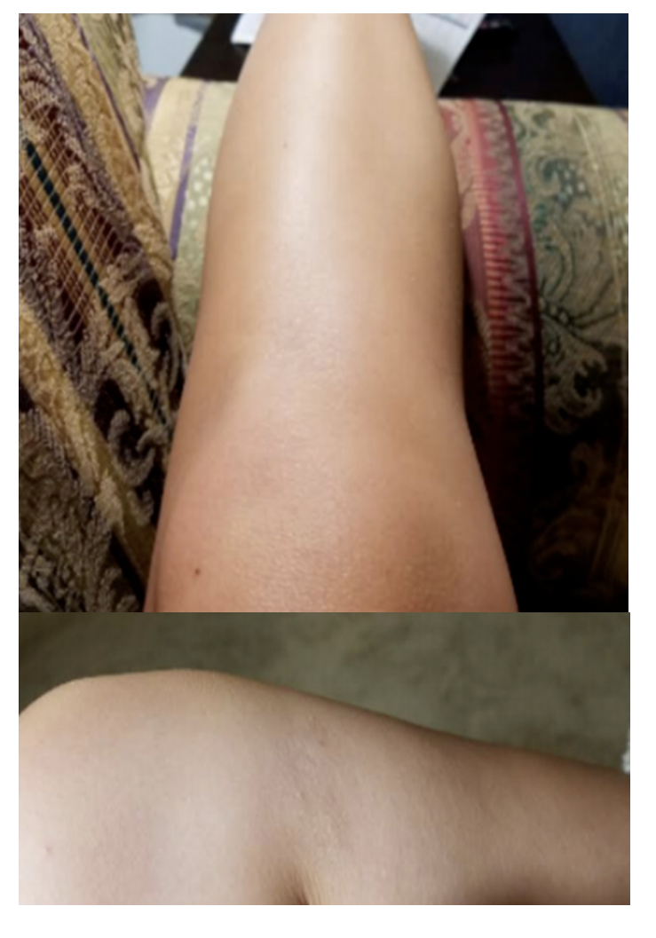 在10次FM治療后,患者開始注意到疼痛、萎縮和皮膚色素的顯著改善。患者的PROMIS身體功能評分從最初表現(xiàn)時的37.8分提高到完成FM后的44.3分(MCID:1.9-2.2)。PROMIS疼痛干擾評分從首次出現(xiàn)時的61.6標準化為FM后的52.6(MCID:2.3-2.4)。與初次身體檢查相比,患者的膝蓋控制和雙側(cè)單腿站立的姿勢都有所改善。由于這些療效,她停用了加巴噴?。ㄋ帲?。