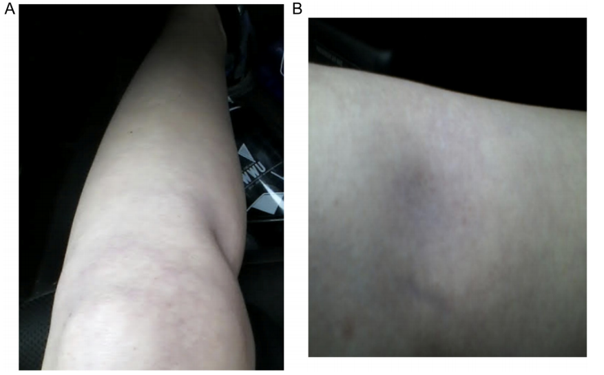 患者隨后經(jīng)歷了疼痛和功能的惡化,并被轉(zhuǎn)診。醫(yī)生注意到了鵝足滑囊的壓痛,開始保守治療,包括活動調(diào)整、物理治療、支架和抗炎藥。患者的疼痛和功能有所改善,但并未緩解。進行了關(guān)節(jié)外鵝足滑囊注射曲安奈德。在注射后的三個月里,患者出現(xiàn)了劇烈疼痛,注射部位周圍的皮膚出現(xiàn)壓痕、變色,根據(jù)環(huán)境溫度的不同,顏色從白色到紫色不等(圖1 AB)。物理治療和支架提供了最小限度的持久緩解。患者持續(xù)出現(xiàn)膝蓋疼痛和功能障礙。