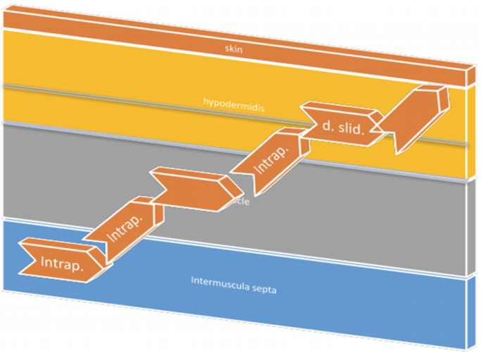 大量臨床研究顯示,F(xiàn)M在多種肌骨疾病上都具有良好的療效。在本項研究中它針對注射皮質(zhì)類固醇后皮下萎縮所導(dǎo)致的粘連。皮下和筋膜粘連的發(fā)展可能成為一個棘手的問題,會導(dǎo)致皮膚神經(jīng)卡壓(見圖3)以及淋巴系統(tǒng)和皮下靜脈功能障礙。它還包含皮下神經(jīng)叢,起到體溫調(diào)節(jié)的作用。這可能解釋了該患者和其他筋膜受限患者的交感神經(jīng)介導(dǎo)的癥狀(體溫變化、膚色變化和異常性疼痛)。