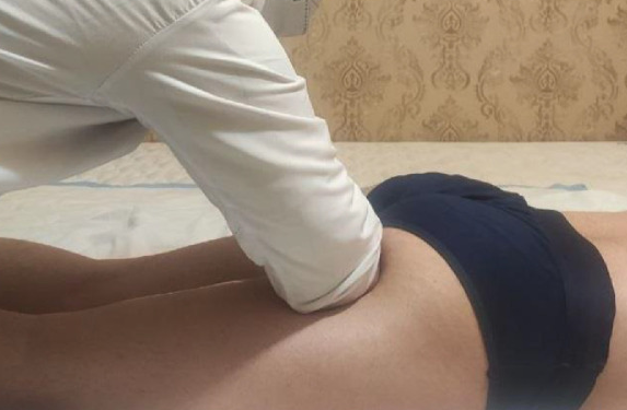 腰部肌筋膜放松組的患者坐在椅子上,向前彎腰。治療師使用掌指關(guān)節(jié)沿著脊柱,從胸中部到骨盆區(qū)域進行筋膜放松。操作重復(fù)5次(圖1)。