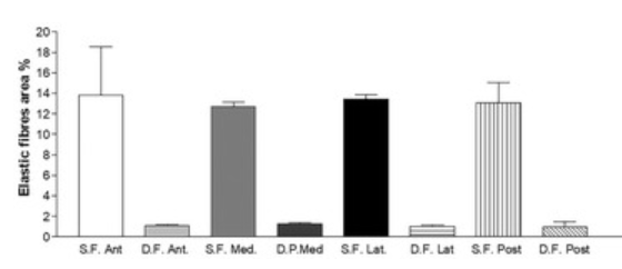 圖5: 不同區(qū)域大腿淺筋膜和深/肌肉筋膜的彈性纖維面積(%)。S.F. = 淺筋膜。D.F. = 深筋膜。Ant=前部;Med=內(nèi)側(cè),Lat=外側(cè);Posterior=后部