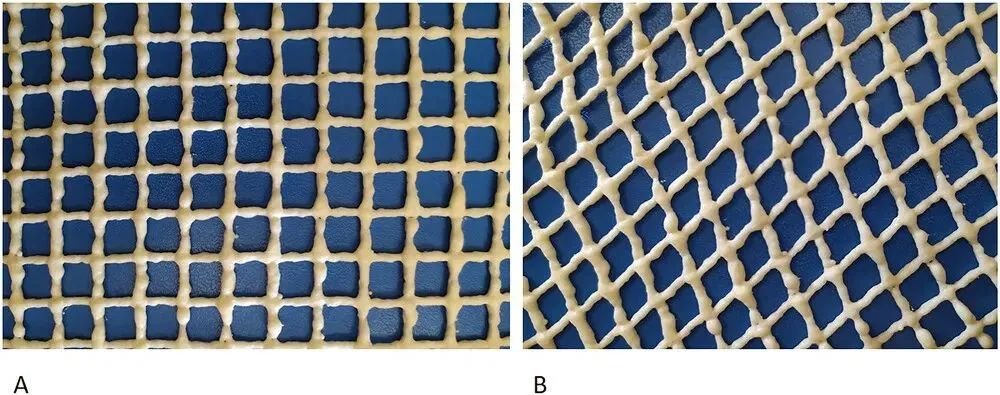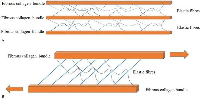 圖6: 深筋膜疏松結(jié)締組織內(nèi)彈性成分的生物力學(xué)行為。(A) 放松狀態(tài)。(B) 運(yùn)動(dòng)狀態(tài),纖維膠原束之間的彈性成分使纖維膠原束相對(duì)于相鄰纖維膠原束運(yùn)動(dòng),并返回初始位置