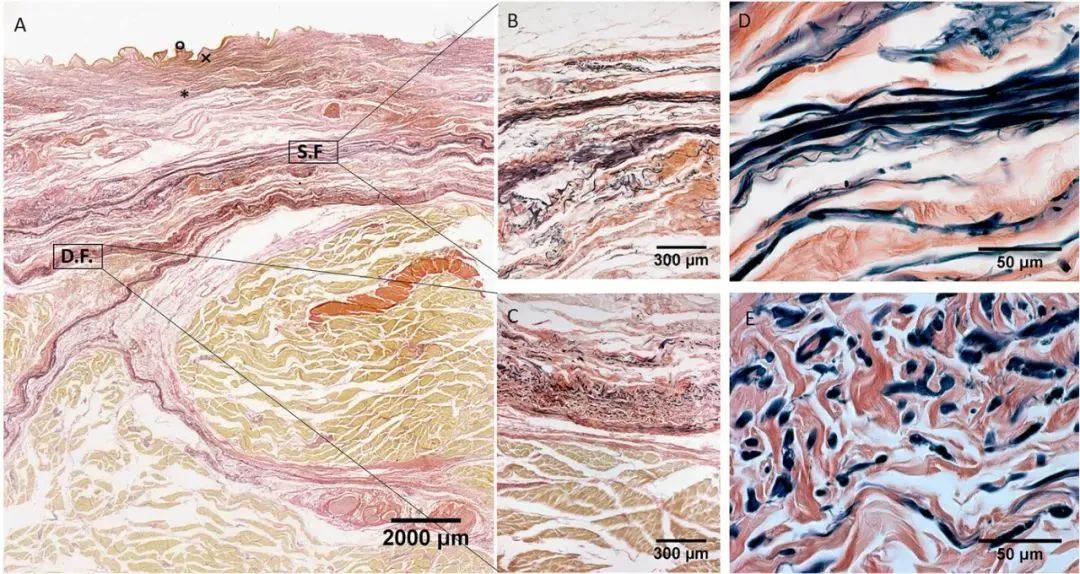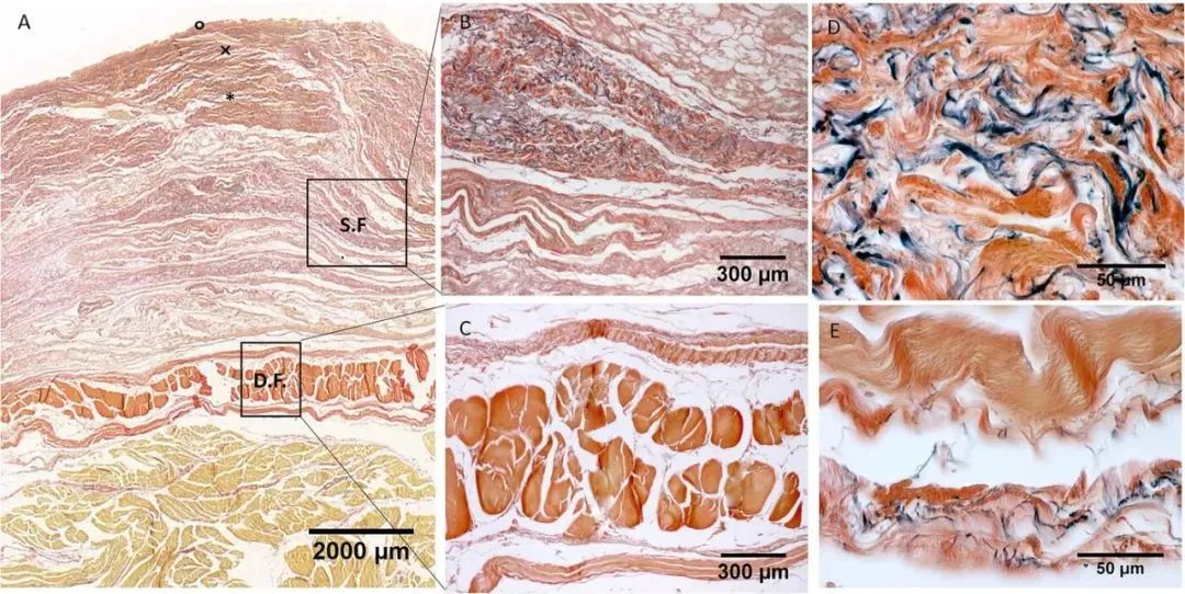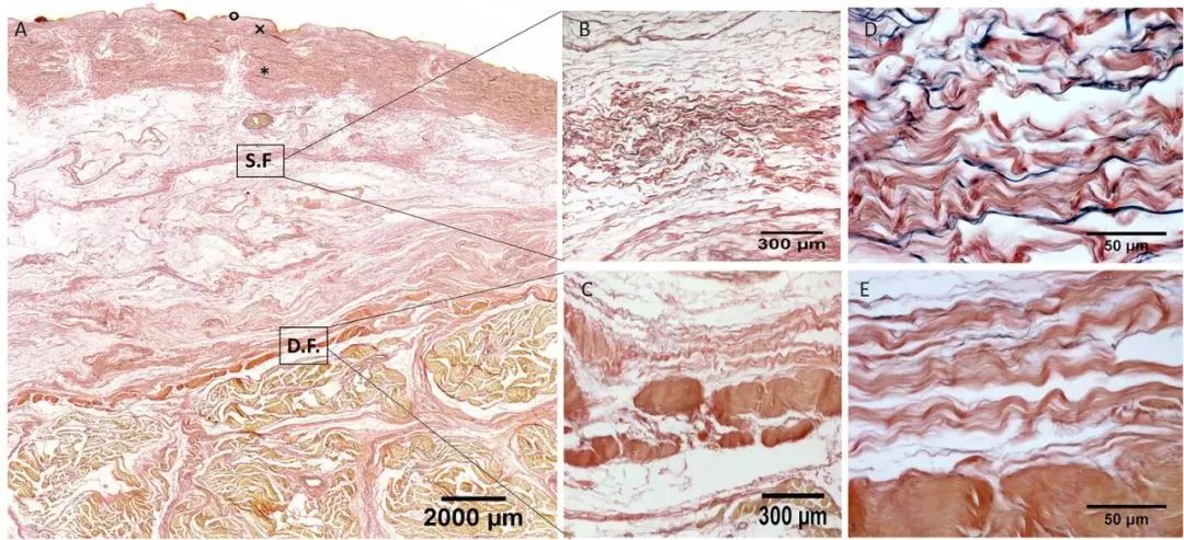 圖4: 后部區(qū)域(A)的組織學(xué)圖像(Weigert Van Gieson 染色),S.F. = 淺筋膜;D.F. = 深筋膜;× = 乳頭狀真皮;* = 網(wǎng)狀真皮;° = 表皮。(B) 和 (D):淺筋膜。(C) 和 (E):深筋膜