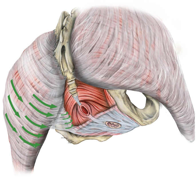 臀大肌及其包膜被證明是通過筋膜延續(xù)與閉孔內(nèi)肌和泌尿生殖膈膜相連。然后,筋膜延伸并連接到肛提肌筋膜。臀大肌和閉孔內(nèi)肌筋膜還包裹著直腸下神經(jīng)和直腸下血管,并與肛門外括約肌相連。