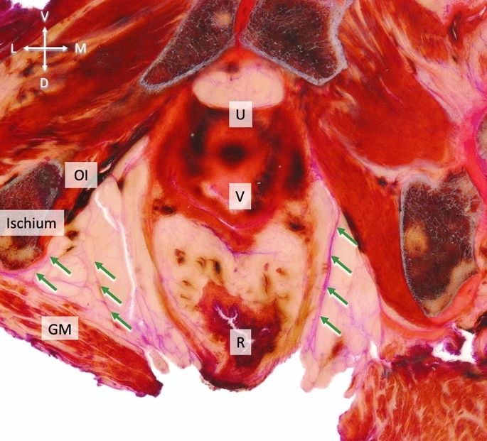 De Blok描述了連接閉孔內(nèi)肌、提肛肌和臀大肌的“半圓形結(jié)締組織帶”。朝向會陰中心,這些結(jié)構(gòu)被描述為矢狀排列,而纖維橫向排列。內(nèi)側(cè)纖維附著于會陰淺筋膜,而外側(cè)纖維附著于臀大肌筋膜、閉孔內(nèi)肌和坐骨結(jié)節(jié)。這種模式與本研究獲得的數(shù)據(jù)一致。