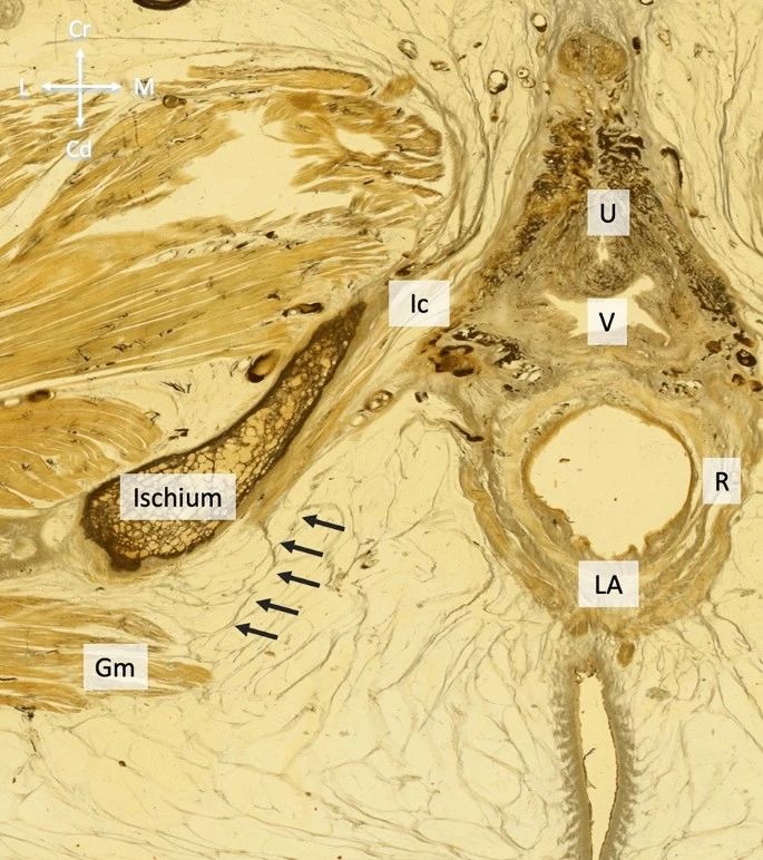 在整個解剖過程中,在這些連接橋中沒有發(fā)現(xiàn)肌肉纖維。臀大肌、閉孔內(nèi)肌和泌尿生殖膈膜之間似乎存在密集的連接研究發(fā)現(xiàn),直腸下血管和直腸下神經(jīng)的鞘不僅包括閉孔內(nèi)肌筋膜的“延伸”,而且還接受臀大肌筋膜的纖維束。