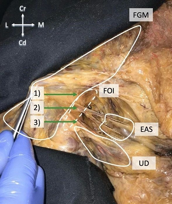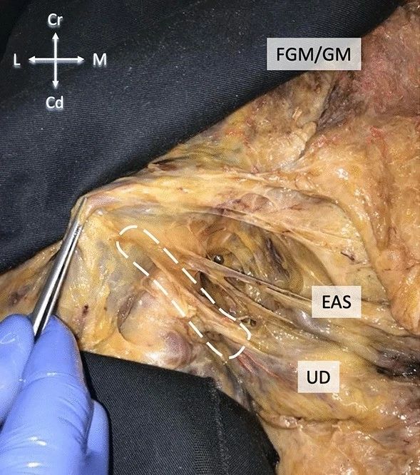 臀大肌筋膜向閉孔內(nèi)肌筋膜的連續(xù)性此前已被其他作者證明:張等人描述了男性坐骨直腸窩的形態(tài),包括“與閉孔內(nèi)肌和臀大肌之間的交界筋膜連接的密集條帶纖維”。這些纖維繼續(xù)進(jìn)入閉孔內(nèi)肌、臀大肌和提肛肌的筋膜。到目前為止,對女性的詳細(xì)描述還有待觀察。