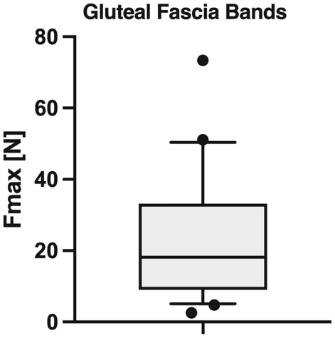 圖7. 顯示結(jié)締組織在應(yīng)變下承受的最大力(Fmax)的箱線圖。箱子的輪廓表示第25和第75百分位數(shù),實(shí)心水平線表示中位數(shù)。須毛表示最小值和最大值。平均而言,F(xiàn)max平均為23.6±17.3 N(范圍為2.6-73.4 N)。