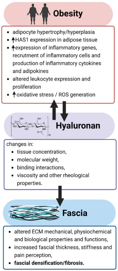 透明質(zhì)酸的物理和化學(xué)性質(zhì)的改變與細(xì)胞外基質(zhì)粘彈性和其他機(jī)械性質(zhì)和生物功能的改變有關(guān),并已被證明是肥胖患者肌筋膜疾病發(fā)展的關(guān)鍵因素。了解這種病理生理學(xué)聯(lián)系為透明質(zhì)酸的潛在治療開發(fā)鋪平了道路。