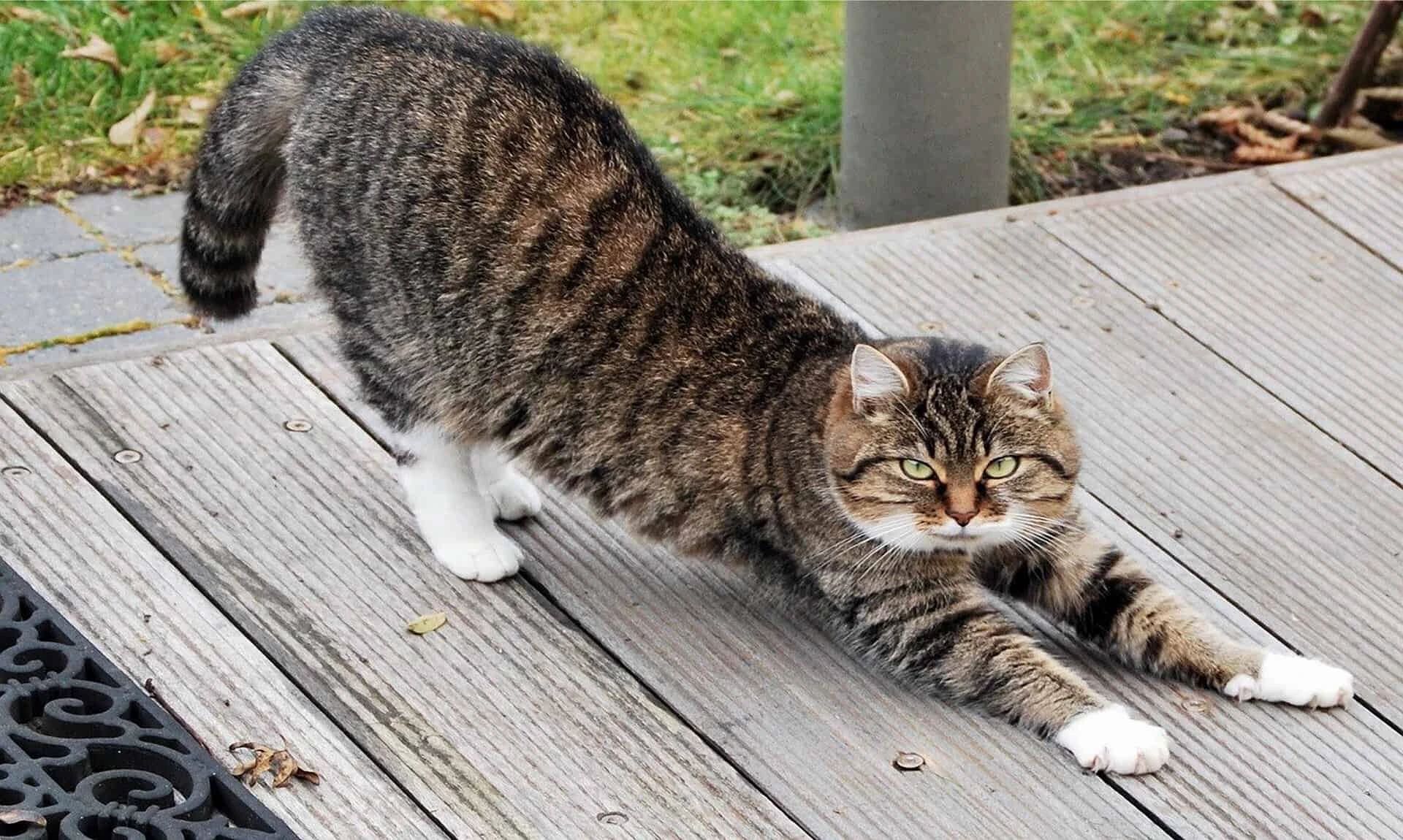 為此,它們還會(huì)將四肢推向地面,從而自動(dòng)地對(duì)軀干和后腿進(jìn)行反向拉伸。瑜伽中的下犬式姿勢(shì)與這種姿勢(shì)非常相似。