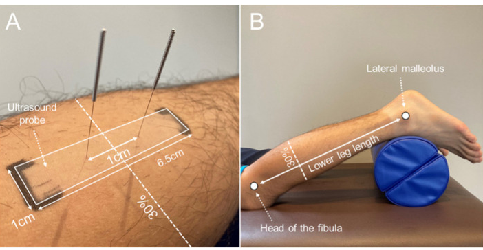 參與者包括12名隨機(jī)選擇的健康成年人。選擇腓腸肌的內(nèi)側(cè)頭作為目標(biāo)肌肉,測量低頻針灸干預(yù)前后深筋膜、肌肉和同一區(qū)域深層肌間筋膜的硬度變化及踝關(guān)節(jié)背屈活動范圍。針灸針插入直到穿過深層肌間筋膜,并以2 Hz的頻率電刺激15分鐘。12條右腿為干預(yù)腿,12條左腿為非干預(yù)腿。
