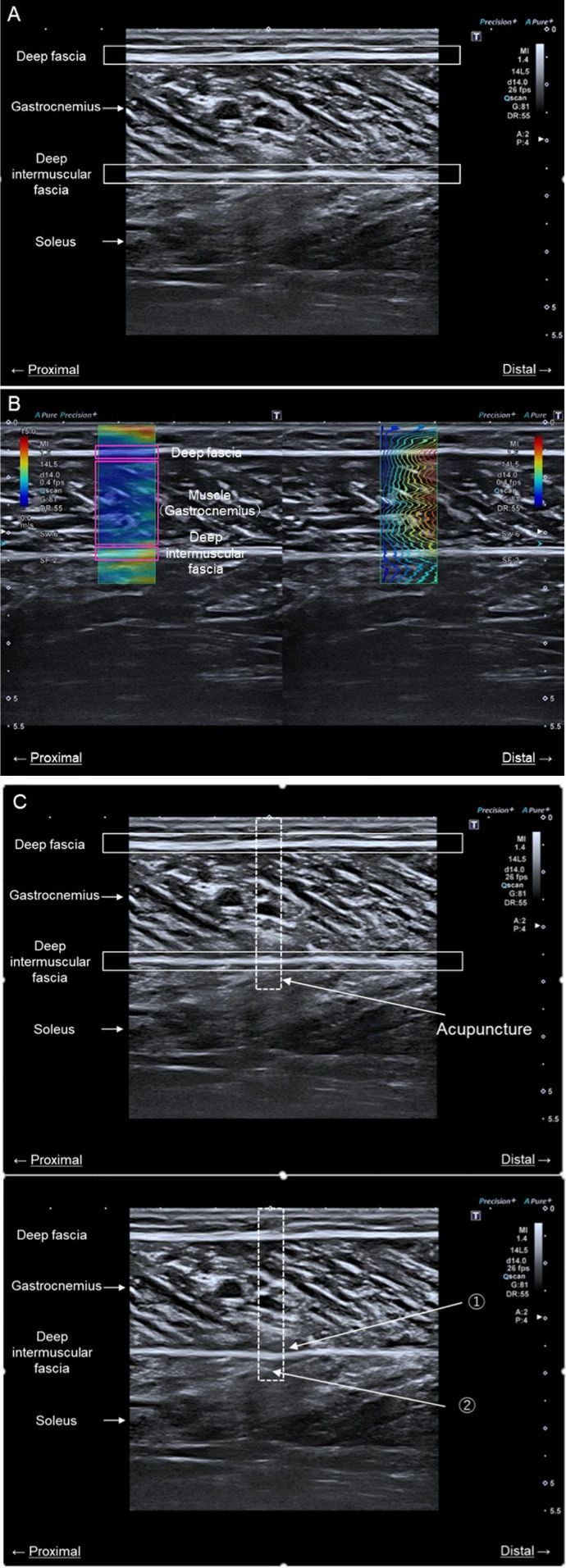 (C) 圖顯示了針灸針插入深度的確認(rèn)。使用超聲成像設(shè)備確定了以下兩個要點(diǎn):在進(jìn)行針灸時,DIF(深層肌間筋膜)是彎曲的;針灸點(diǎn)在DIF下方可見。虛線方框表示針灸針插入的區(qū)域。