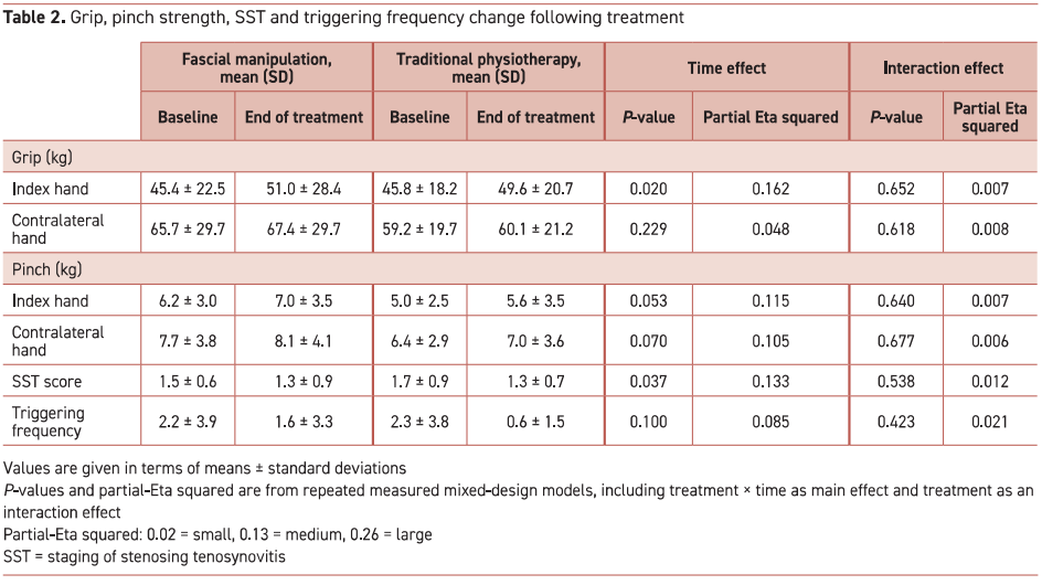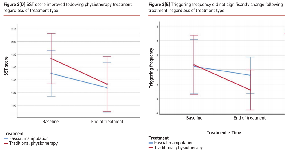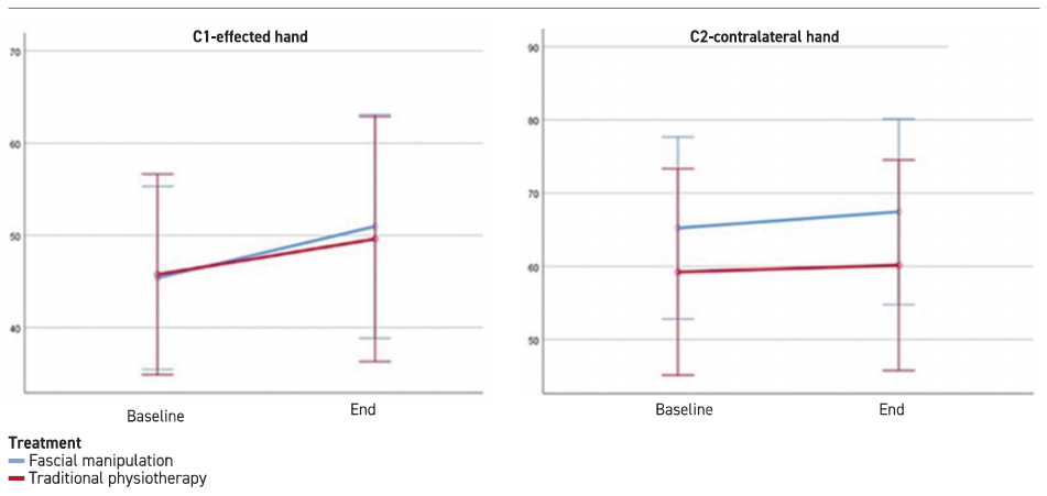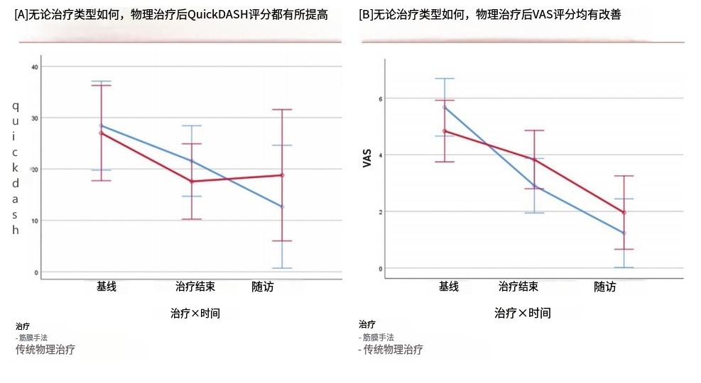 兩個組的Quick-DASH和VAS評分在治療后均有顯著改善。但在筋膜手法組中,兩個測驗(yàn)的評分均呈現(xiàn)更持續(xù)的下降趨勢。