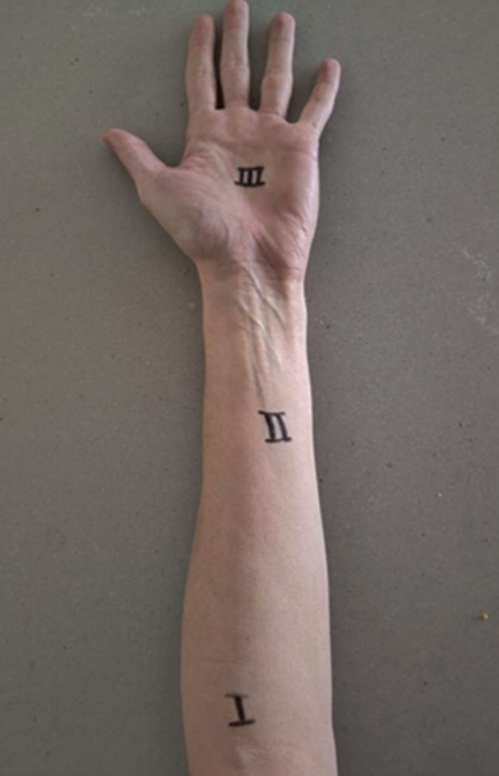 ②位于掌長肌和橈側(cè)屈肌腱之間的旋前方肌近端部位的CC;