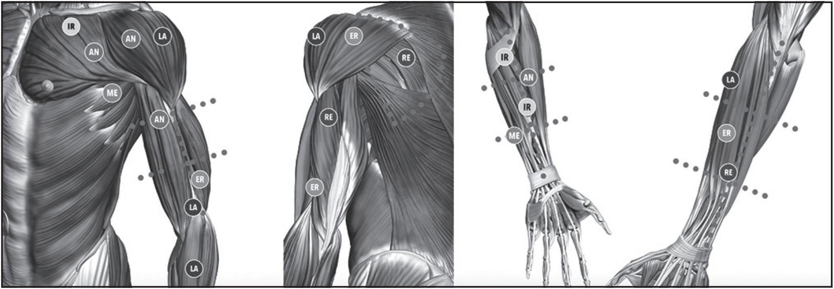 (圖1:協(xié)調(diào)中心。AN:向前運(yùn)動(dòng),RE:向后運(yùn)動(dòng),LA:向外運(yùn)動(dòng)或外展;ME:內(nèi)收:IR:內(nèi)旋:ER:外旋。)