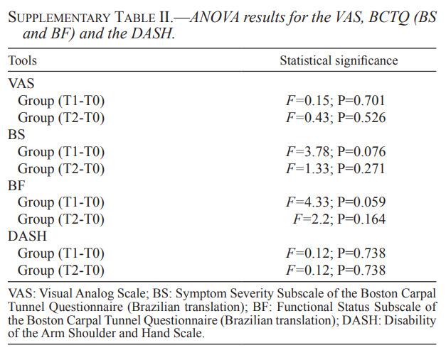 臨床結(jié)果比較了視覺(jué)模擬量表(VAS)、波士頓腕管問(wèn)卷(BCTQ)的癥狀嚴(yán)重程度子量表(BS)和功能狀態(tài)子量表(FB),以及臂、肩、手功能障礙量表(DASH量表)。