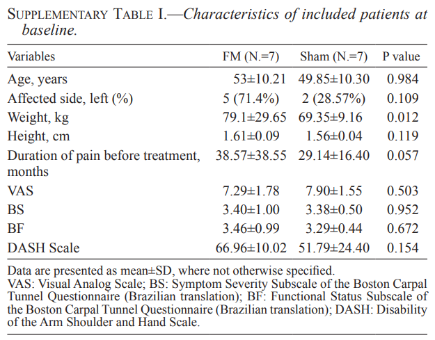 所有評(píng)估均在基線(T0)、十天后(T1)和最后一次治療后三個(gè)月(T2)進(jìn)行。在T0和T1時(shí)還記錄了肌電圖正中神經(jīng)傳導(dǎo)速度和潛伏期。