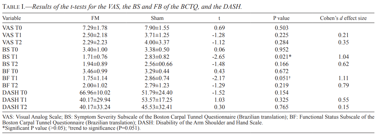 即使這項(xiàng)研究為小規(guī)模試驗(yàn),但我們?cè)谕蠊芫C合征患者中依舊能驗(yàn)證出筋膜手法在5周治療后具有的顯著效果。效應(yīng)大小也超出了我們的預(yù)期(1.11對(duì)0.91)。