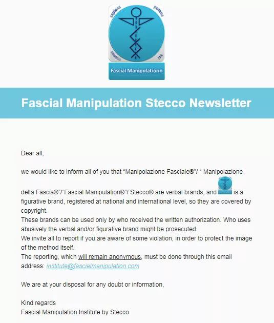 我們想要告知各位“Manipolazione Fasciale?”/ “ Manipolazione della Fascia?”/“Fascial Manipulation?”/ Stecco? 以上文字商標和