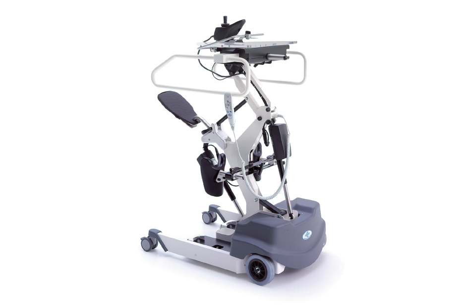This device enables the user to assume and maintain an upright position, and to move around indoors independently without assistance from a carer. The user is lifted into a standing position by means of an electric motor operated by hand control, while the movement of the service tray accompanies the user along the lifting operation. The service tray has an anti-crushing safety system sensor which can be activated at any time by the user (accessory code AC0692). The aid is provided with a two-motor electric drive which allows unaided movement by using a joystick. The footplates are fitted with adjustable heel rests (accessory code AC0686).The adjustment of the height of the main structure, directly involving the setting of the knee supports and the service tray is motorized and operated by hand control. The trunk is held at both sides by two handles which can be tilted and adjusted in width. Back support is provided by a standard seat adjustable in depth. The whole system of adjustments allows to better suit the whole aid accordingly to the anthropometrical characteristics of the user. For further information, please refer to the section on options, accessories and adjustments.