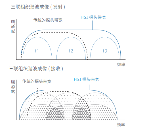 通過(guò)同時(shí)發(fā)射三聯(lián)組織諧波(Triad-THI),獲得了極高的圖像分辨率,而且也實(shí)現(xiàn)了高階諧波信號(hào)的串聯(lián)。與傳統(tǒng)的THI相比,Triad-THI發(fā)射三組分離的諧波分量,能夠覆蓋整個(gè)接受譜,在探頭掃查區(qū)域內(nèi),尤其是淺層結(jié)構(gòu)和狹窄部位,同樣能夠獲得高分辨率的圖像質(zhì)